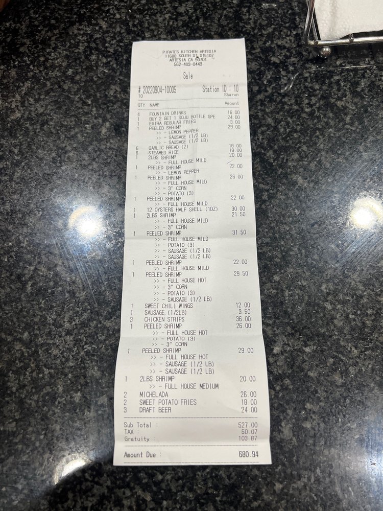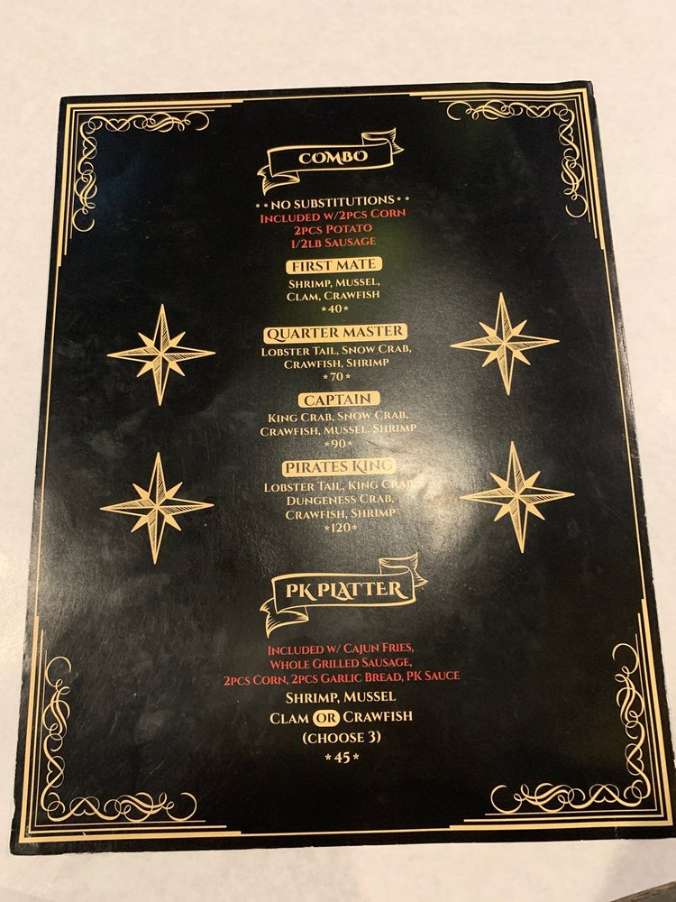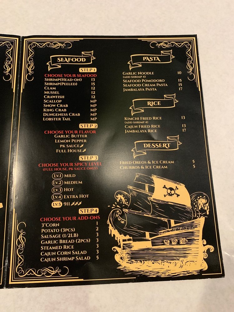"Introducing the menu at Pirates Kitchen, a Cajun/Creole seafood haven located in Artesia, CA. This Asian-owned restaurant offers a wide array of options including their famous 2 lbs shrimp special for $20, calamari, guac nachos, chicken tenders, sweet potato fries, and more. Customers rave about the flavorful seafood boils, buffalo wings, fried oysters, and shrimp broils. The Full House sauce is a favorite among diners, with its blend of garlic butter, Cajun, and lemon pepper. The service is top-notch, with friendly staff ensuring a fantastic dining experience. With a trendy and casual ambiance, Pirates Kitchen is perfect for groups, kids, brunch, dinner, and late-night bites. Don't miss out on their Happy Hour specials and beer & wine options. Whether you dine in, take out, or opt for delivery, Pirates Kitchen promises a delicious and memorable meal for seafood lovers."